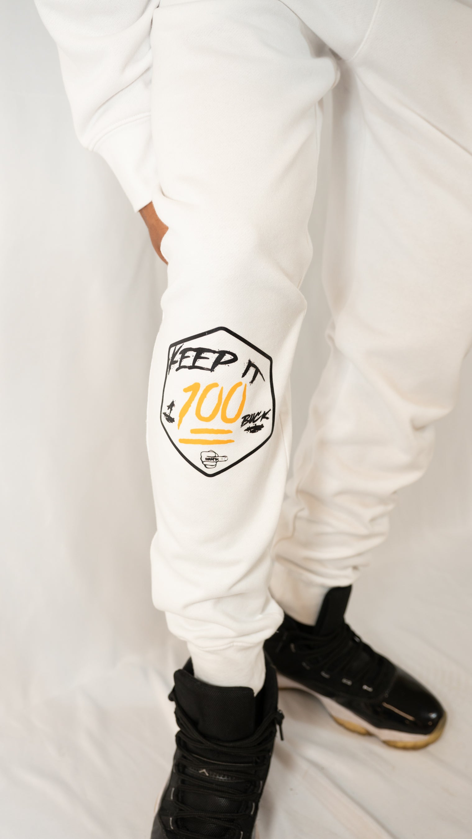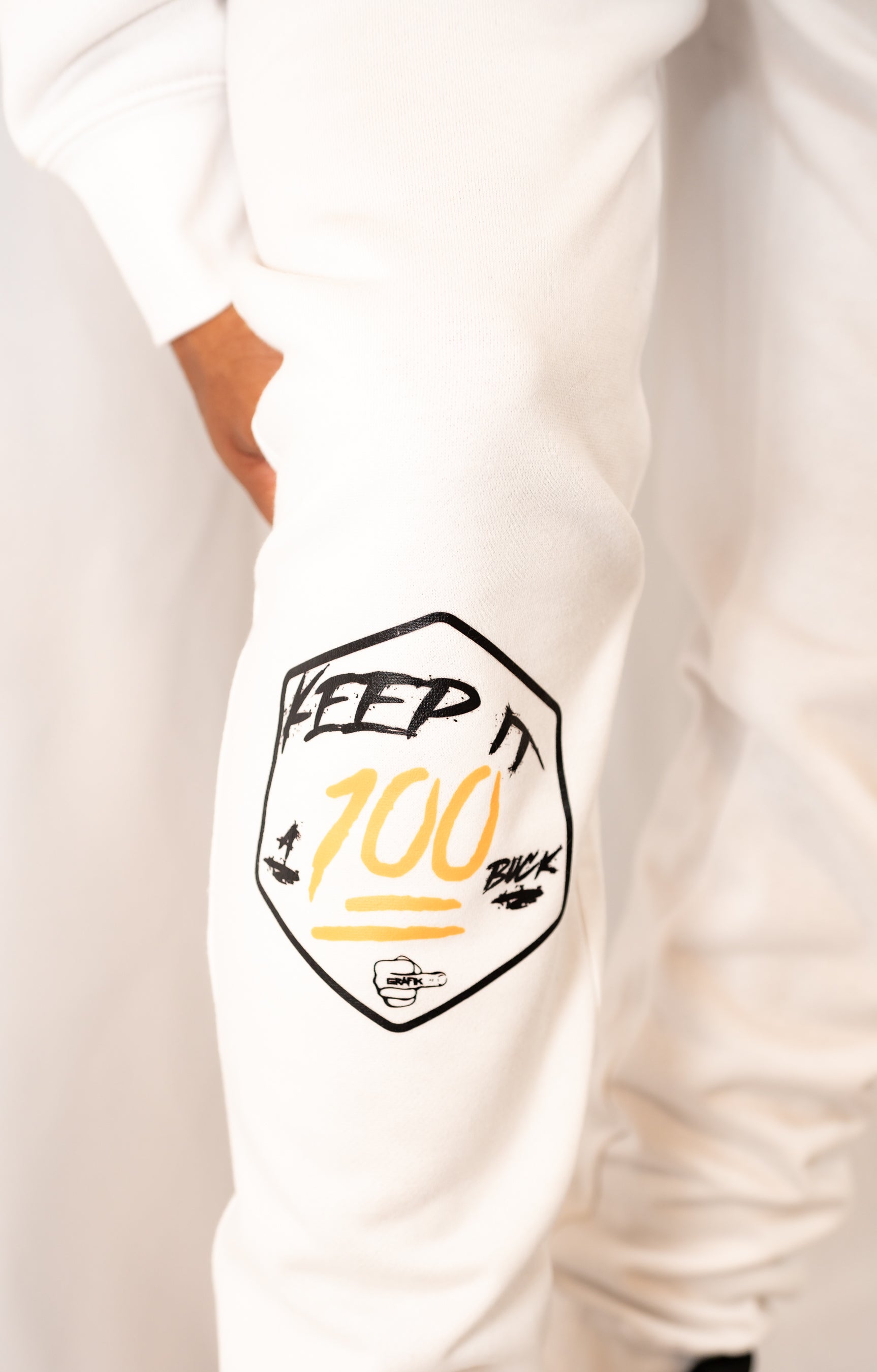 - Printed Keep It 100 Logo (on front right leg)